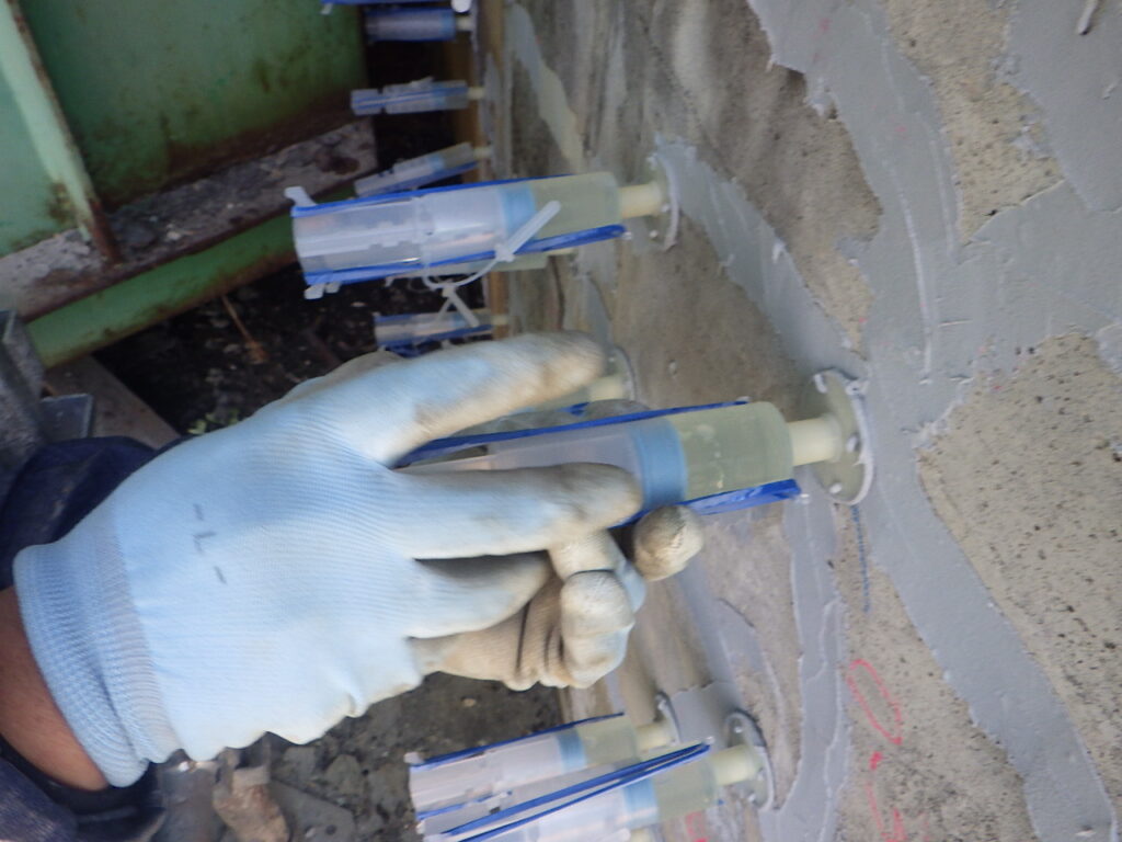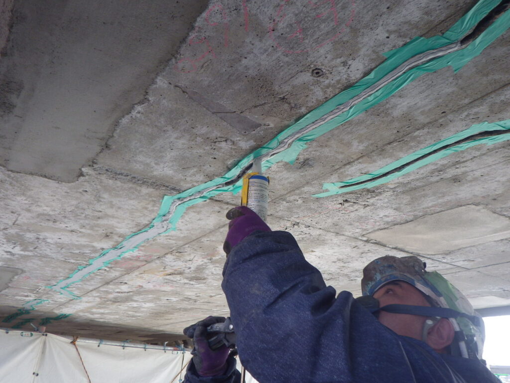 シール材で蓋をし、注射器による樹脂の低圧注入でひびを中から補修。