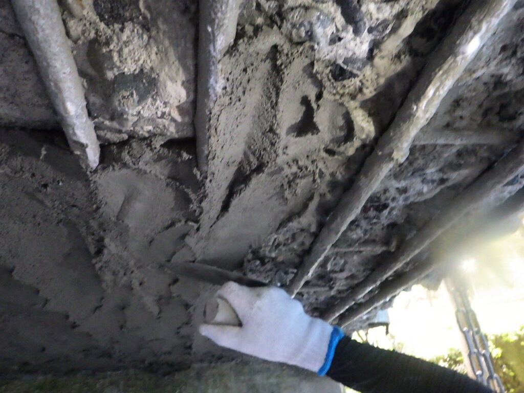打診により浮き箇所を斫り、ポリマーセメントで修復
